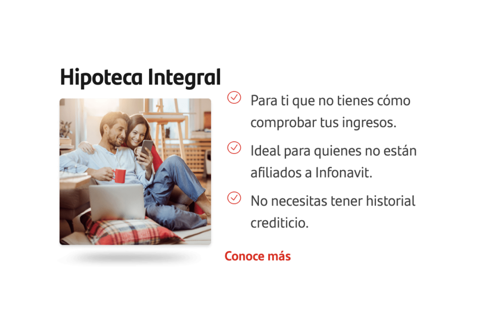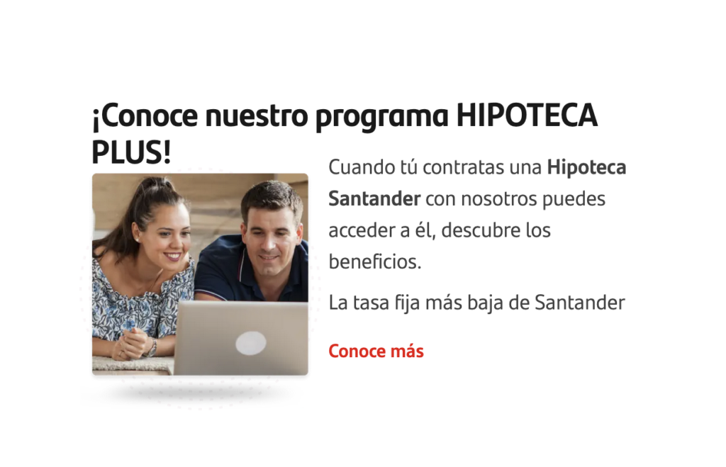Hay una hipoteca Santander para comprar un departamento, para remodelar tu hogar, comprar un terreno ¡o mejorar la tasa de interés que ahora tienes! Encuentra el producto que mejor se adapte a lo que buscas y obtén más información.
